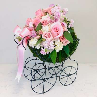 This is a large, sculpted wire baby carriage filled with an arrangement in shades of pink for a new baby.