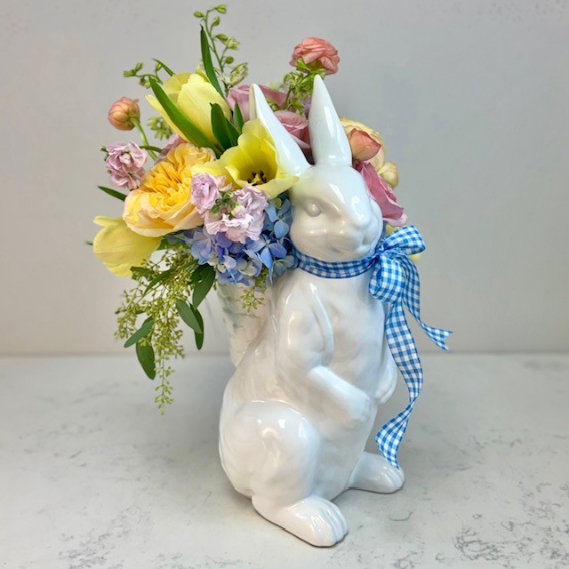 This ceramic bunny is 16″ in height and can be arranged with beautiful flowers as if he just came out of a garden.
