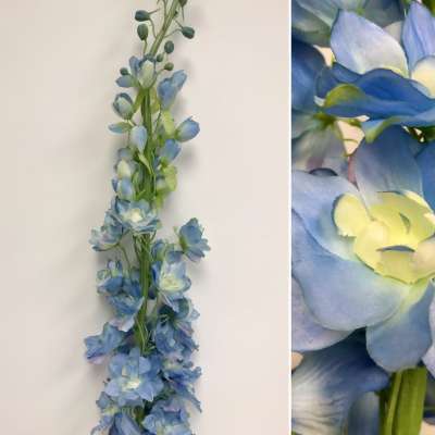 These silk delphinium stems have multiple blooms and leaves, and on a stem that is 54″ in length.