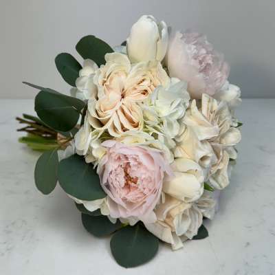 A handheld bouquet of garden roses, peonies, hydrangea, tulips and eucalyptus tied and pinned with satin ribbon. These flowers (colors) can be adjusted according to the occasion, individual’s desire and need.