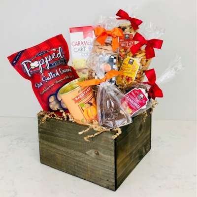 Our gift basket is filled with seasonal gourmet food items in a stained wooden box with plastic liner. This box can also be used for plantings or any other decorative or storage need as well.