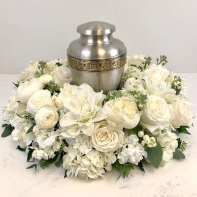 Our deluxe ring is shown with white flowers including roses, lilies, ranunculus, peonies, scabiosa, stock, hydrangea, hypericum berry, and greenery. Arranged is approximately 18″.