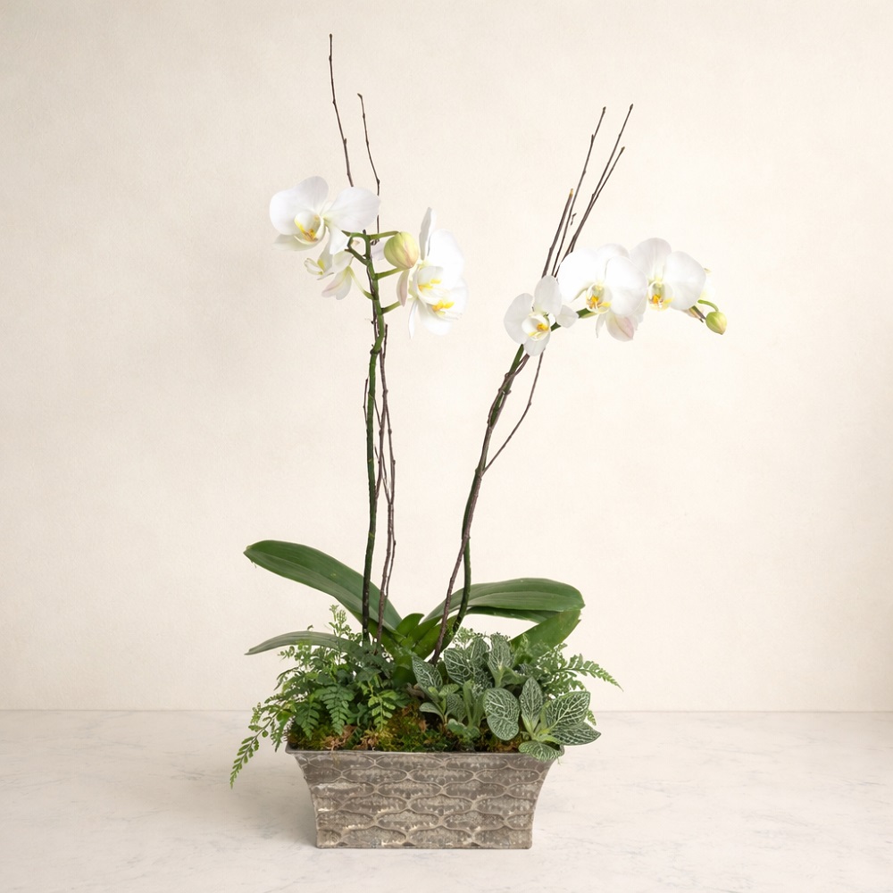 This garden features one blooming double stemmed phalaenopsis orchid arranged with a variety of small plants and moss. Orchids often come in other colors such as pink or deep purple. Arrangement will be made with white as shown unless otherwise stated.
