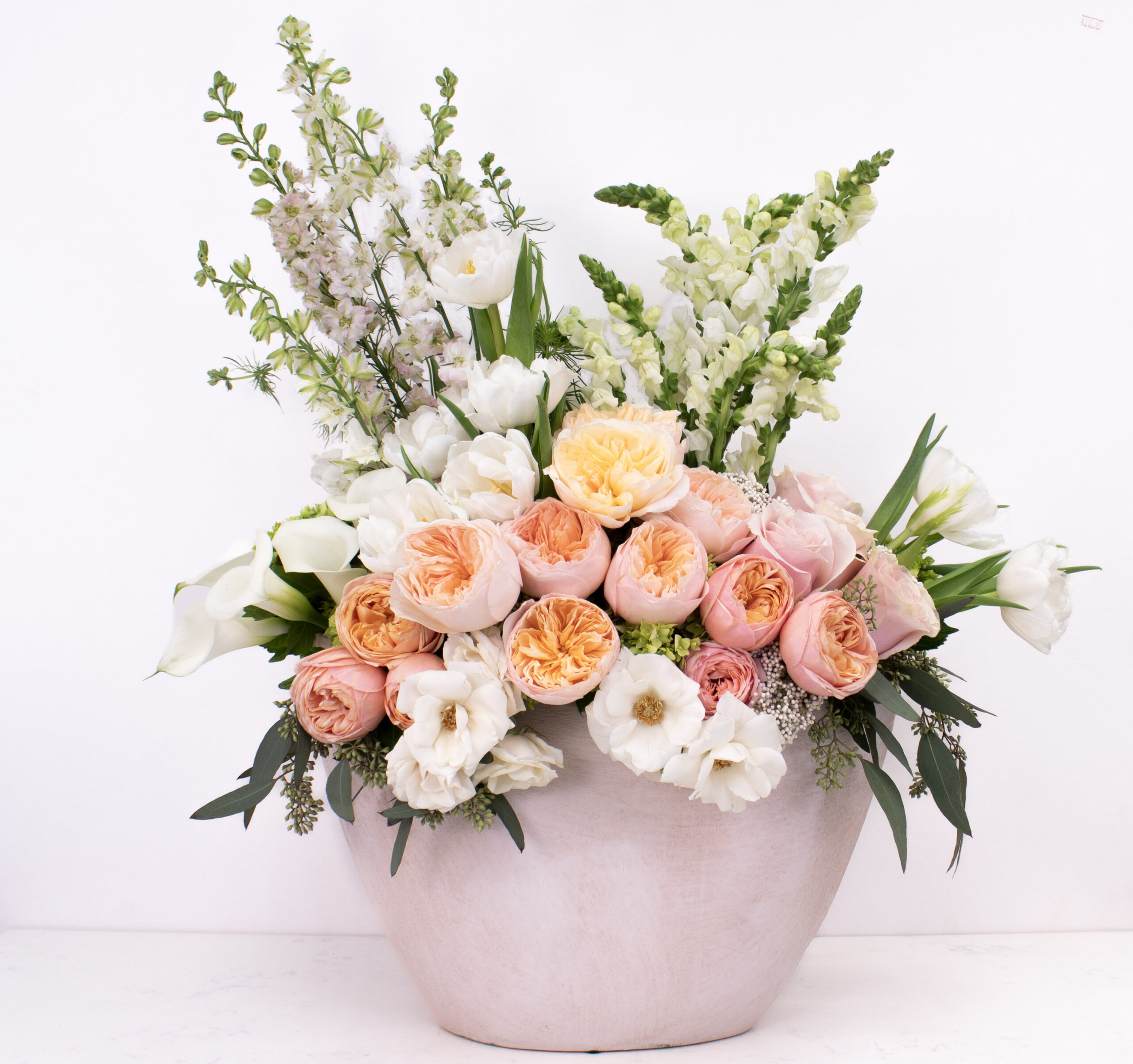 This arrangement is soft yet striking, featuring garden roses, tulips, mini calla lilies, and linear accent flowers in delicate shades of peach and white.