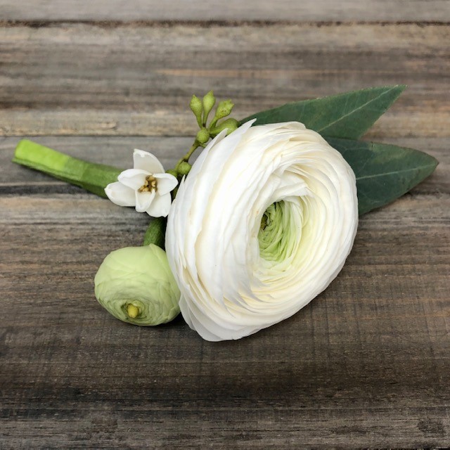 This simple and stylish boutonniere features a beautiful ranunculus bloom with seasonal greenery. We have a variety of colors from which to choose. Please specify your color preference in the space provided below.